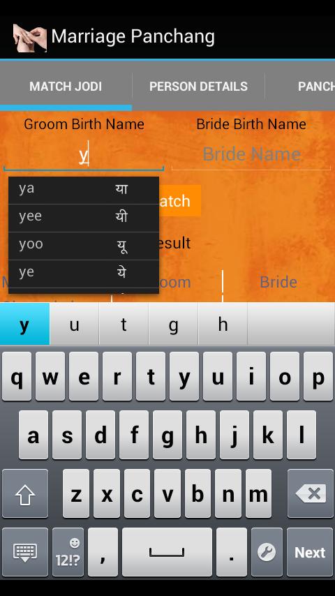 Das letzte aktualisierte am 9. August 2015 Die Vorhersagelogik wird in der Anwendung hinzugefügt. Jetzt verfolgt die Anwendung die Benutzeraktivität und versucht, den Geburtsnamen des Anwendungsbenutzers zu erraten. Daher muss der Benutzer nur seinen Partnernamen eingeben, um die Anwendung wiederholt zu verwenden.